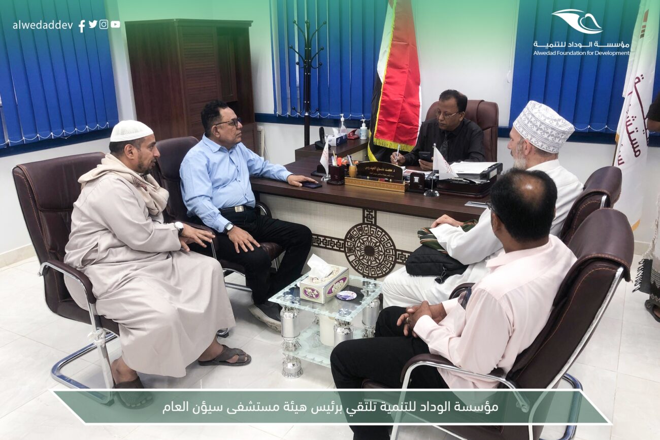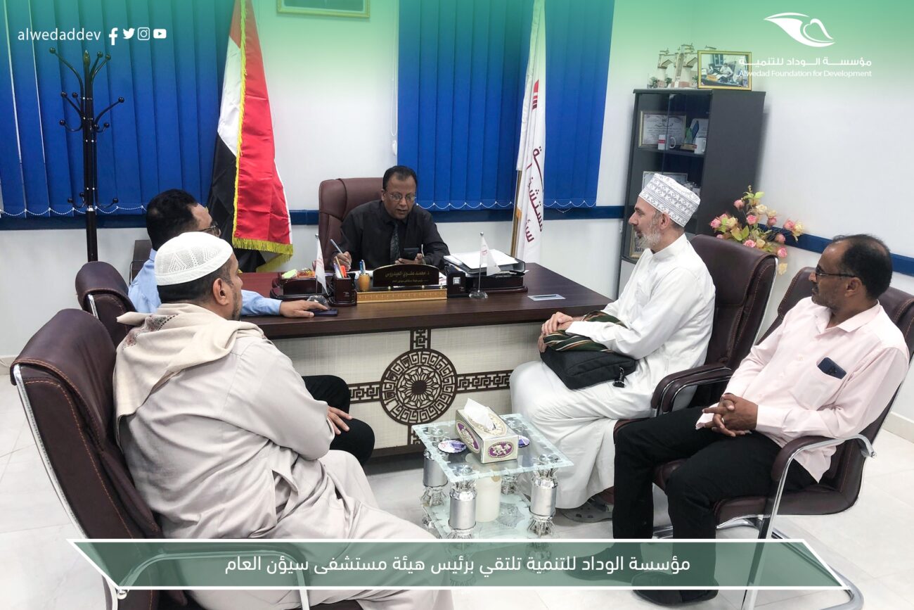 التقى وفد من مؤسسة الوداد للتنمية ممثلاً بالسيد حسين بن علي السقاف ( المدير التنفيذي بمؤسسة الوداد للتنمية) بالدكتور محمد علوي العيدروس ( رئيس هيئة مستشفى سيؤن العام ) ؛ حضر اللقاء الأستاذ محمد حداد الكاف ( مدير مستشفى عيديد الخيري ) ود. محمد عوض العامري ( مدير مستشفى تريم العام) والدكتور البريطاني حبيب شروفي ( أخصائي طب الأسرة ) والاخ علي خالد الهادي ( مسؤول قسم الصحة بمؤسسة الوداد للتنمية)