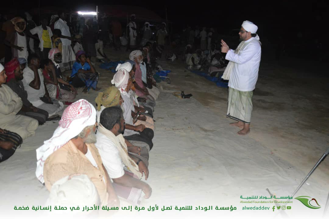 وصل وفد الحملة في أولى محطاته من رحلته الإغاثية والإنسانية بقرية (حظف) أولى المناطق التابعة لمسيلة الأحرار بعد رحلة شاقة وصعبة في هضاب ومنحدرات وادي وصحراء حضرموت استغرقت 11 ساعة للوصول إلى مسيلة الأحرار المنطقة المستهدفة من قبل المؤسسة ، حيث ألقى الداعية أبوبكر بن حسن بلفقية عند الوصول محاضرة دينية توعوية عن الصلاة وفروضها وكيفية المحافظة عليها ، ثم تحرك الفريق إلى( منطقة ثوبة ) لأداء صلاة المغرب والعشاء وإقامة محاضرة دينية توعوية بمسجد المنطقة من قبل الداعية السيد سالم بن عمر بن حفيظ بالإضافة إلى حضور الزواج الجماعي ومشاركة أبناء المنطقة أفراحهم عبر الزوامل الفرائحية المصحوبة بالأشعار والأهازيج الشعبية الجميلة..
